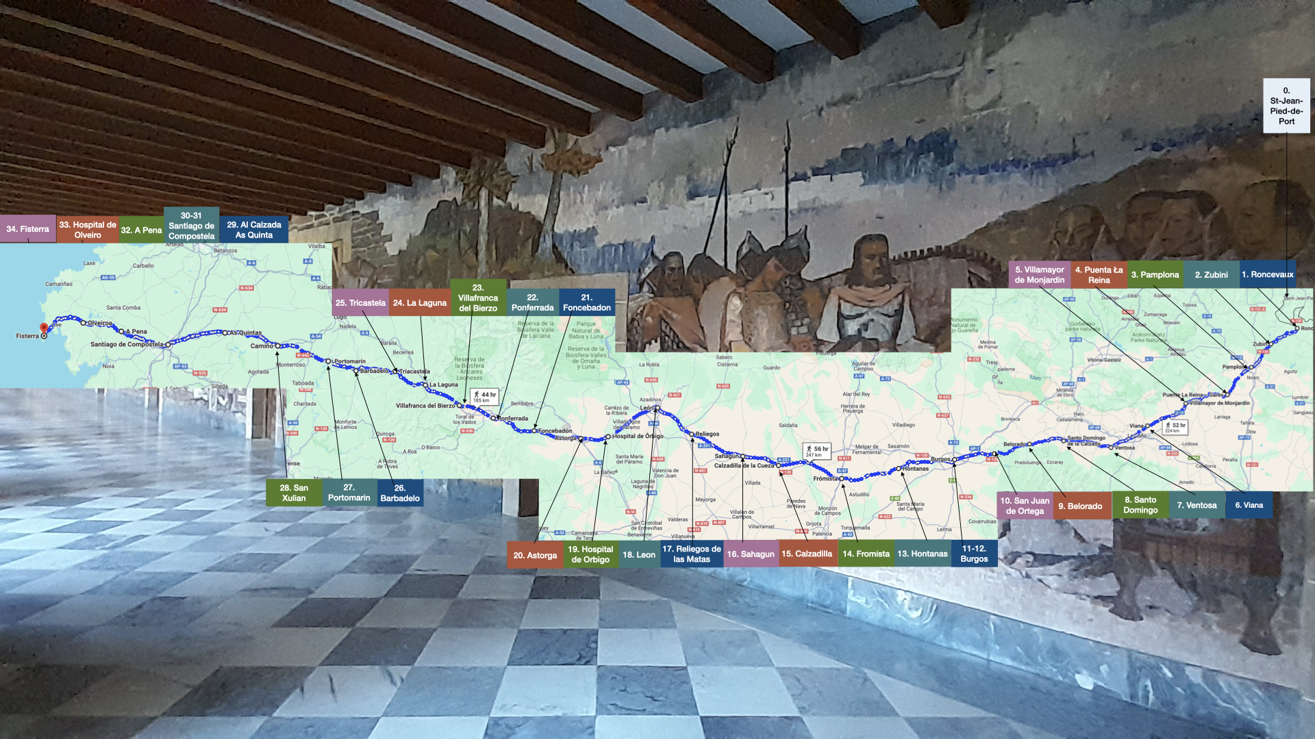Here is the list of my stages; I slept in gîtes d’étapes except once in Burgos. Most of the times I shared dinner with the hosts.